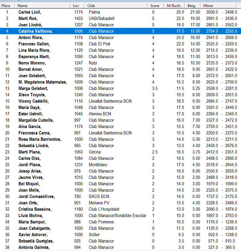 Podem destacar una important participació, hem de reconéixer la bona salut de l’scrabble de les Illes, i des d’una esfera més local, la bona classificació del repressentant de l’Associació Club Scrabble El Prat, en Francesc Gallén, que ha acabat en la sisena posició.